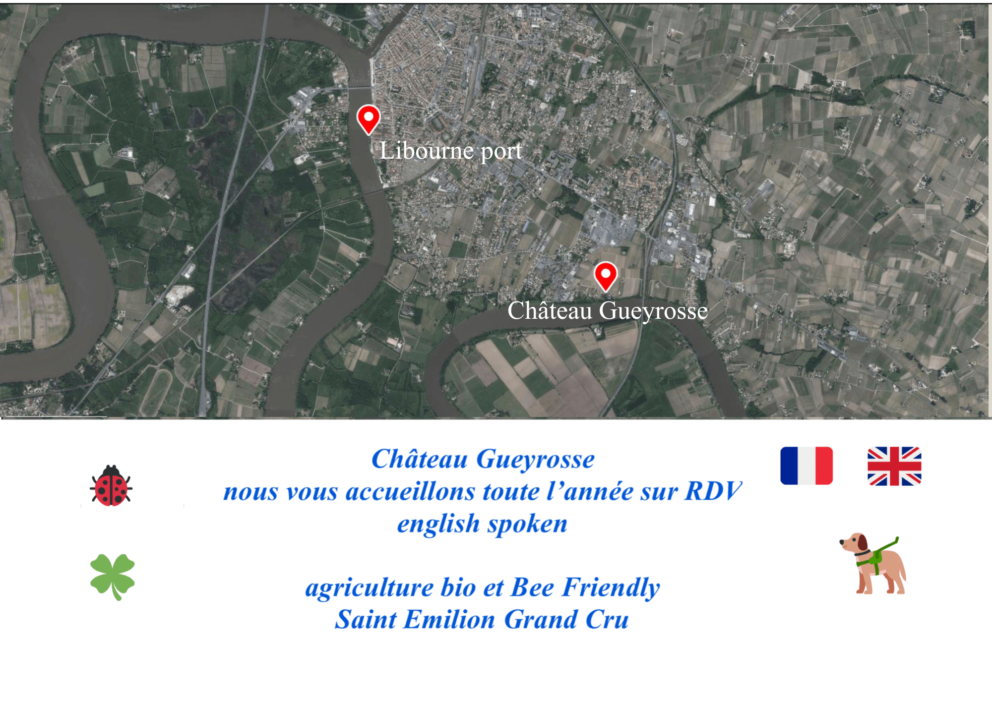 Le Château Gueyrosse est situé sur la commune de Libourne, à seulement 12 minutes de Saint-Émilion et à environ 40 minutes de Bordeaux, au cœur de l’une des régions viticoles les plus réputées au monde.